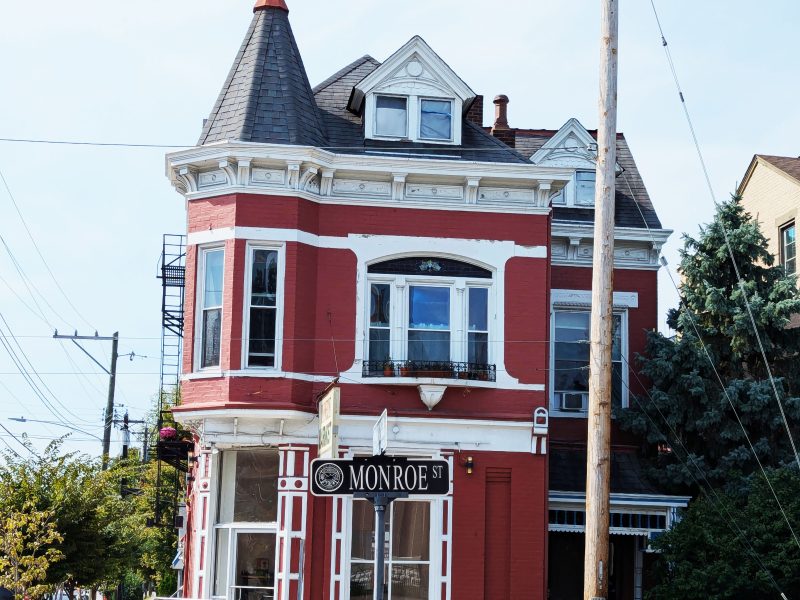 The house’s façade is painted in a muted yet sophisticated gray, a perfect complement to the intricate cream-colored trim that highlights the elaborate cornices, window surrounds, and decorative brackets. The combination of colors enhances the depth and texture of the architectural details, giving the house an inviting yet regal presence.