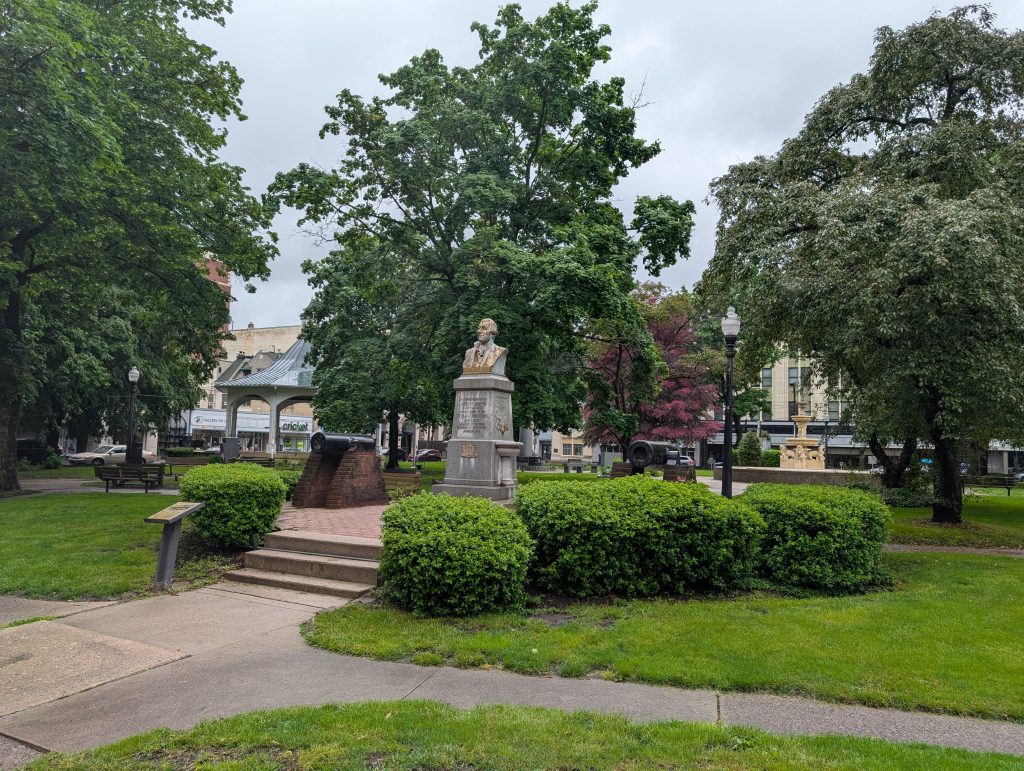 Joseph Johns stands quietly at the park’s center, framed by trees that have seen as many seasons as the city has stories.