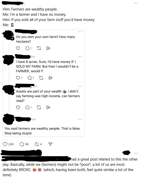 Farmers carry a kind of wealth that doesn’t spend easily — the rhythm of their work, the pride of growing food, the connection to land and season. That is a wealth measured in meaning, not cash. When someone tells a farmer to “sell everything and you’d have money,” it ignores the shape of their life. It treats stability as optional and purpose as a luxury.