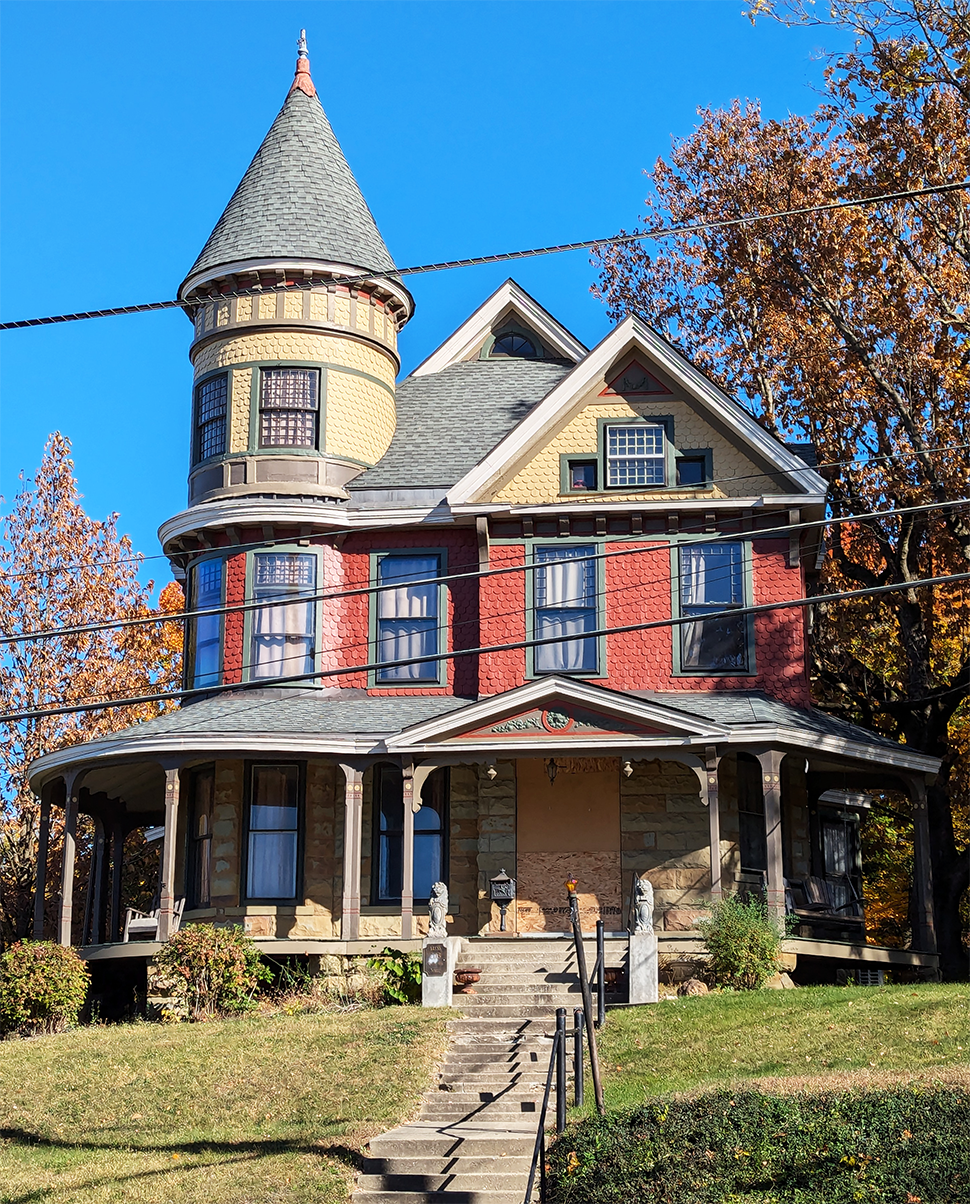 Seen from the street, the Kress Home presents itself as a study in confidence, complexity, and deliberate display. It sits elevated above the sidewalk on Ninth Street Hill, using the slope not as an obstacle but as a compositional device. The house does not meet the street—it rises from it.